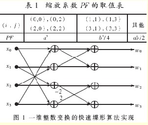 ·2q,PF稱為縮放系數(shù),根據(jù)元素在陣列塊中的不同位置,其取值如表1所示,Qstep為量化步長,由0至51共52個量化參數(shù)QP決定,QP增加1,Qstep增加12.5%;q=15+QP/6,QP/6取整數(shù);對于幀內(nèi)宏塊f取2q/3,幀間宏塊f取2q/6。需要指出的是,MF的值可根據(jù)PF和QP的取值經(jīng)簡單計算得到,并可形成表格,通過查表方式便可實現(xiàn)硬件運(yùn)算,并有效地提高了運(yùn)算速度。