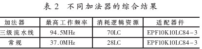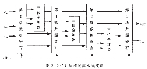 (2)針對不同運(yùn)算的位寬需要,設(shè)計專用的加法器和乘法器。本文對整數(shù)變換中的加法器采用三級流水線加法器,實現(xiàn)9位加法,每級流水線完成三位超前進(jìn)位加法,將邏輯延遲限制在三位加法器之內(nèi)。圖2給出了9位加法器的流水線實現(xiàn)框圖。選用EPF10K10LC84-3作為適配器件,經(jīng)過Synplify Pro 7.3綜合,結(jié)果表明這種加法器具有較優(yōu)的最高工作頻率和硬件開銷。如表2所示, 常規(guī)加法器的最高工作頻率為37.0MHz,消耗資源卻為28LC,而經(jīng)過優(yōu)化的三級流水線加法器在消耗資源增加不多的情況下,其最高工作頻率相比常規(guī)加法器提高了257%,達(dá)到94.5MHz。