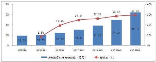 受市場(chǎng)的推動(dòng),未來(lái)幾年我國(guó)綜合指揮調(diào)度系統(tǒng)建設(shè)的范圍將逐步擴(kuò)大。2011到2014年,我國(guó)綜合指揮調(diào)度市場(chǎng)的復(fù)合增長(zhǎng)率將達(dá)到28.16%,2014年市場(chǎng)規(guī)模將達(dá)到96.44億元。