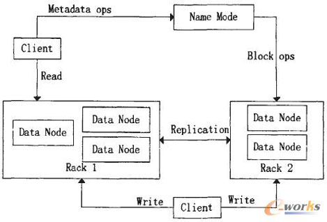 在云端,本系統(tǒng)采用開(kāi)源框架Hadoop 0.20.2來(lái)實(shí)現(xiàn)。該框架主要提供Hadoop分布式文件系統(tǒng)(HDFS)和Map Reduce。其中HDFS為分布式計(jì)算存儲(chǔ)提供了底層支持,圖2是HDFS的結(jié)構(gòu)示意圖: