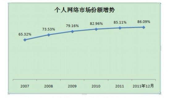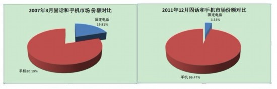手機的增長非常顯著,從2007年開始,手機用戶每年以42.7%的速度增長。手機的市場份額從2007年的80.19%增加到2011年12月的96.47%,現(xiàn)在已經(jīng)遠遠超過了固話。