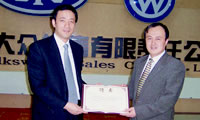 向一汽-大眾客服中心部長石濤(右)頒發(fā)“副主任委員”聘書