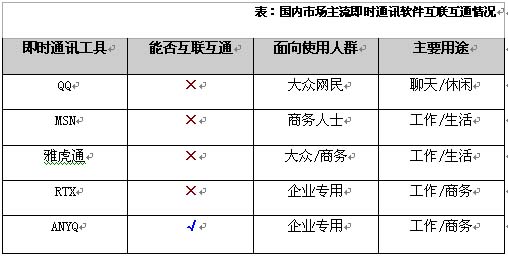 根據(jù)夏先生的提醒,筆者找到這了這個(gè)ANYQ的有關(guān)信息,據(jù)了解,該產(chǎn)品是面向企業(yè)用戶的一款商務(wù)協(xié)作軟件,其目的就是商務(wù)協(xié)作、統(tǒng)一通訊。因?yàn)樵摦a(chǎn)品采用開放的國際標(biāo)準(zhǔn)協(xié)議——XMPP協(xié)議,使其具有聯(lián)系多個(gè)即時(shí)通訊信息孤島的能力。通過各個(gè)嵌入式的網(wǎng)關(guān),企業(yè)可以通過ANYQ與OICQ、ICQ、AIM、MSN、YAHOO上的客戶、合作伙伴進(jìn)行聯(lián)系、實(shí)時(shí)交流、公文共享等企業(yè)來往。