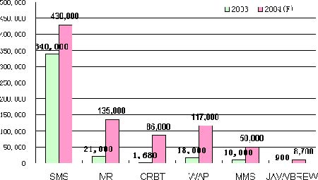 短信業(yè)務(wù)是各類(lèi)移動(dòng)增值業(yè)務(wù)中用戶(hù)量最多的新業(yè)務(wù),2003年已達(dá)到1.4億,WAP、IVR和CRBT業(yè)務(wù)2004年都取得高速增長(zhǎng)。其中WAP用戶(hù)規(guī)模達(dá)到2500萬(wàn),其市場(chǎng)規(guī)模由2003年的1.8億元增長(zhǎng)為2004年的11.7億元。
