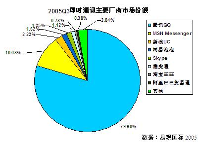 在現(xiàn)階段的中國即時(shí)通訊市場(chǎng),三大廠商優(yōu)勢(shì)明顯。騰訊 QQ 以其最早進(jìn)入即時(shí)通訊市場(chǎng)、商業(yè)模式創(chuàng)新成功、用戶群龐大等各種因素所帶來的優(yōu)勢(shì)仍舊延續(xù)著對(duì)即時(shí)通訊市場(chǎng)的幾乎壟斷式的占有,市場(chǎng)份額高達(dá)79.6%。緊隨其后的