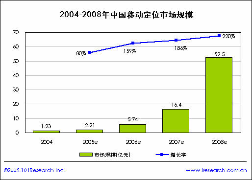 隨著中國移動定位市場的啟動和各種新興定位業(yè)務(wù)的推廣,該市場在未來三年將進入一個穩(wěn)定增長期。根據(jù)iResearch艾瑞市場咨詢的研究分析,2005年國內(nèi)移動定位市場規(guī)模達到2.21億元,比2004年增長80%。這主要得益于中國移動親子通業(yè)務(wù)和中國聯(lián)通手機導(dǎo)航等相關(guān)定位業(yè)務(wù)的推廣。受“奧運經(jīng)濟”的刺激,在2006-2008年的三年內(nèi),該市場的增長率將保持在150%以上。到2008年中國移動定位市場將達到52.5億元,成為最具競爭力的3G核心業(yè)務(wù)之一。