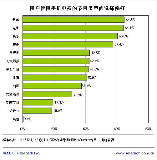 iReserach艾瑞市場咨詢《2007年手機(jī)電視研究報告》研究結(jié)果顯示,手機(jī)終端價格將是影響用戶使用手機(jī)電視業(yè)務(wù)的首要驅(qū)動因素,其次是手機(jī)電視服務(wù)資費(fèi)標(biāo)準(zhǔn)。另外研究數(shù)據(jù)發(fā)現(xiàn),手機(jī)用戶希望在手機(jī)電視上看到的內(nèi)容類別情況:新聞、電影、娛樂和音樂是用戶首要選擇的電視節(jié)目類型,用戶的提及率均在60%以上,另外用戶希望能夠通過手機(jī)看電視劇、天氣預(yù)報、綜合節(jié)目和體育等節(jié)目類型。由此發(fā)現(xiàn),新聞、娛樂和生活類資訊是用戶期望手機(jī)電視節(jié)目的重要類型。
