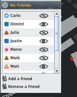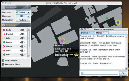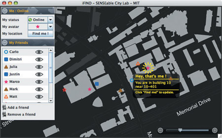 該軟件名為iFind,乍一看類似任何典型的即時通信軟件,也需要雙方相互邀請,這樣才能進入對方的好友名單。用戶可以選擇暫時隱藏起來,不讓某個好友或者整個群組看見自己,他們還可以完全把某人從好友名單中刪除。不過iFind的好友名單增加了地圖,可以實時顯示這些朋友在MIT校園的哪個角落。地圖顯示了通過Wi-Fi登錄到MIT網(wǎng)絡(luò)上的好友,讓用戶可以為每個朋友創(chuàng)建獨特的迷你頭像,能看到誰在學(xué)校河邊閑逛、誰在樓上圖書館看書。