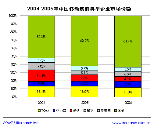iResearch艾瑞市場(chǎng)咨詢最新的研究成果顯示,2004-2006年,在中國(guó)的移動(dòng)增值市場(chǎng)中,TOM、新浪的市場(chǎng)份額處于不斷下降的趨勢(shì),其中下降最明顯的是新浪網(wǎng),它的市場(chǎng)份額已由2004年的14.4%下降到2006年的5.9%,但與此同時(shí)空中網(wǎng)的市場(chǎng)份額卻處于增長(zhǎng)趨勢(shì),已由2004年的5.6%增長(zhǎng)到2006年的7.3%.