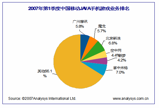 從企業(yè)實力和市場份額來看,目前手機(jī)游戲市場主要有三股力量組成,以空中等為代表的全業(yè)務(wù)線電信增值服務(wù)商(SP),以新浪等為代表的互聯(lián)網(wǎng)門戶綜合服務(wù)商,以米格、魔龍為代表的專業(yè)手機(jī)游戲產(chǎn)品與服務(wù)提供商(SP)。根據(jù)中國移動“百寶箱”第1季度收入數(shù)據(jù),易觀注意到,掌中米格、北京新浪、廣州摩訊位列前三,前三名占據(jù)了近20%的市場份額。夢網(wǎng)手機(jī)游戲精品業(yè)務(wù)的三家服務(wù)提供商第一季度收入排名為:米格、新浪、空中網(wǎng)!