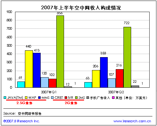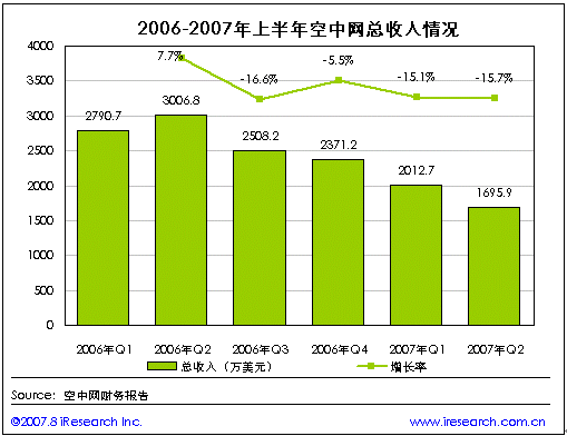 空中網(wǎng)2007年第二季度財報數(shù)據(jù)顯示,第二季度空中網(wǎng)的總收入1695.9萬美元,同比負(fù)增長43.6%,環(huán)比負(fù)增長15.7%。與第一季度相比在空中網(wǎng)兩個產(chǎn)品平臺的主要2G業(yè)務(wù)和2.5G的業(yè)務(wù)收入都出現(xiàn)了不同程度的下降,但2G業(yè)務(wù)中的IVR業(yè)務(wù)收入則出現(xiàn)了大幅上升。