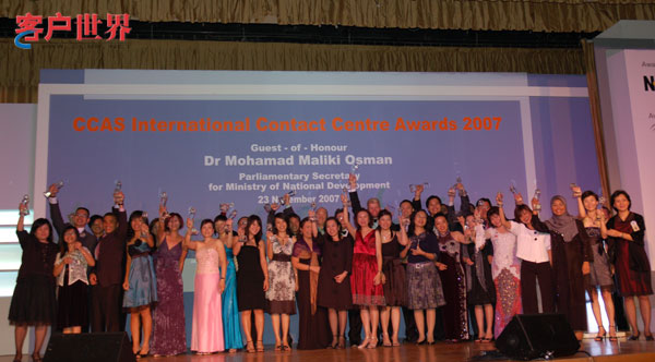2007年11月23日,新加坡。2007年度國(guó)際呼叫中心大獎(jiǎng)?lì)C獎(jiǎng)典禮今天在新加坡Ritz Carlton酒店隆重舉行;繼2006年首度接軌亞太地區(qū)最佳呼叫中心評(píng)選活動(dòng)之后,中國(guó)呼叫中心行業(yè)協(xié)會(huì)CNCCA再次組團(tuán)出訪獅城新加坡。在本年度國(guó)際最佳呼叫中心評(píng)選的角逐當(dāng)中,來(lái)自中國(guó)的中國(guó)電信深圳分公司10000號(hào)客戶服務(wù)中心、中國(guó)移動(dòng)通信集團(tuán)廣東有限公司客戶服務(wù)(廣州)中心、中國(guó)工商銀行電子銀行中心攜手榮膺最佳呼叫中心大獎(jiǎng)。
