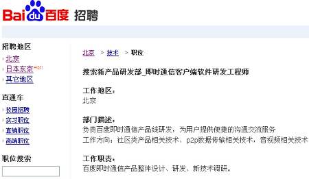 據(jù)百度招聘頁面介紹,百度搜索新產品研發(fā)部主要負責百度即時通信產品線研發(fā),為用戶提供便捷式溝通交流服務,通信客戶端軟件研發(fā)工程師的工作職責是百度即時通信產品整體設計、研發(fā)、新技術調研。