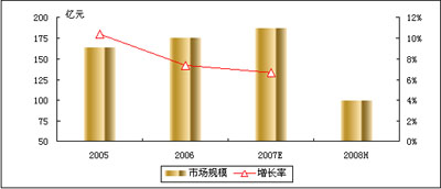 圖1 2004-2008年中國(guó)電信行業(yè)應(yīng)用市場(chǎng)規(guī)模