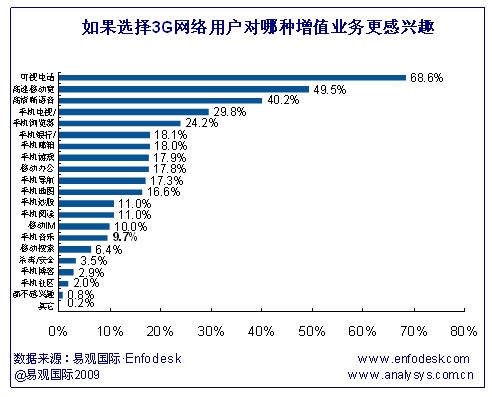 據(jù)易觀Enfodesk《中國(guó)3G市場(chǎng)用戶調(diào)研報(bào)告2009》研究發(fā)現(xiàn),可視電話成為最受用戶歡迎的增值業(yè)務(wù),除此之外,高速移動(dòng)寬帶業(yè)務(wù)和高清晰語(yǔ)音受用戶選擇比例也較高,分別達(dá)到49.5%和40.2%。與此相反的是,手機(jī)社區(qū)、手機(jī)博客和殺毒/安全業(yè)務(wù)受歡迎程度最小。