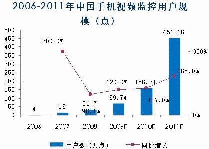 諾達(dá)咨詢預(yù)測(cè),2006年中國手機(jī)監(jiān)控用戶以4萬點(diǎn)計(jì)算,2009年隨著運(yùn)營商3G網(wǎng)絡(luò)建設(shè)和3G業(yè)務(wù)的推進(jìn),用戶數(shù)將有大幅度增長(zhǎng),2010年用戶將達(dá)到158.31萬點(diǎn),2011年達(dá)到451.18萬點(diǎn)。