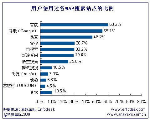 據(jù)易觀國(guó)際(Analysys International)《中國(guó)移動(dòng)搜索市場(chǎng)用戶調(diào)研報(bào)告2009》研究發(fā)現(xiàn)此次調(diào)研樣本用戶使用過的各WAP搜索站點(diǎn)比例情況基本可以分為三個(gè)梯隊(duì):