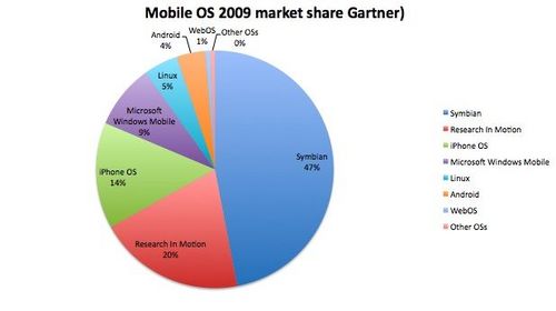 根據(jù)Gartner的數(shù)據(jù)顯示,去年共銷(xiāo)售出的智能手機(jī)達(dá)1.72億部,比前年上漲了24%,然而全世界手機(jī)的銷(xiāo)售總量卻并無(wú)起色(2008年為12.2億部,而2009年為12.1億部。在去年銷(xiāo)售的所有手機(jī)中,智能手機(jī)占14%,較2008(11%)年有所提升。iPhone盡管去年漲勢(shì)迅猛,只占去年各種手機(jī)銷(xiāo)售總量的2%。
