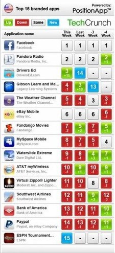 PositionApp提供的數(shù)據(jù)顯示,F(xiàn)acebook長(zhǎng)期位居App Store應(yīng)用商店最流行應(yīng)用的榜首。排名第二的是流媒體音樂(lè)網(wǎng)站Pandora的應(yīng)用Pandora Radio,該款應(yīng)用在四周前從第三位上升至第二位,目前占據(jù)第二的位置已有四周時(shí)間。在PositionApp提供的排名中,包括了許多來(lái)自大公司的應(yīng)用。如eBay、社交網(wǎng)站MySpace、美洲銀行、貝寶(PayPal)都位居前列。