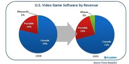 相對(duì)于全美游戲機(jī)及便攜游戲市場(chǎng)來(lái)說,iPhone/iPod Touch占游戲銷售總額的5%。(此數(shù)字包含了如PlayStation和Xbox之類的游戲機(jī)銷售額,但不包括網(wǎng)游和社交游戲)據(jù)Flurry公司數(shù)據(jù)顯示,2009年游戲銷售額占蘋果公司應(yīng)用程序總收入13.6億美元的37%。