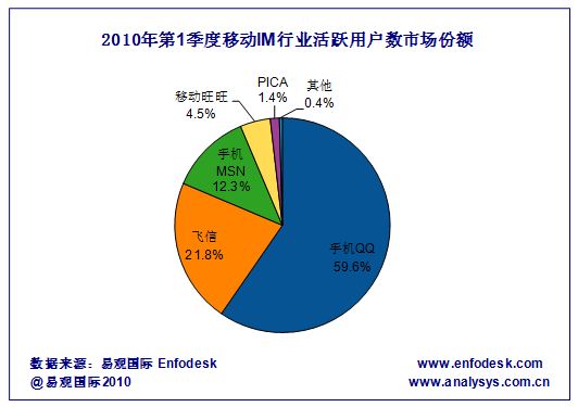 據(jù)易觀國際Enfodesk產(chǎn)業(yè)數(shù)據(jù)庫近期發(fā)布的《2010年第1季度中國市場移動IM數(shù)據(jù)監(jiān)測報(bào)告》研究顯示:2010年第1季度中國市場移動IM活躍用戶數(shù)環(huán)比增長超過18%,總數(shù)突破1.6億,累計(jì)賬戶數(shù)環(huán)比增長10.97%,總數(shù)超過3.8億,相比09年第4季度依然取得了較快的增長。但是基于整體市場來看,移動IM活躍用戶數(shù)市場格局并沒有發(fā)生太大變化,手機(jī)QQ仍然以59.6%的市占率名列市場第一,飛信、手機(jī)MSN位列二三名,具體市場占比及排名如下圖所示: