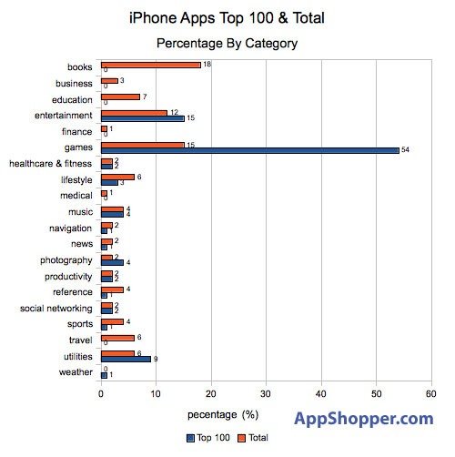 下圖是iPhone和iPod touch的Top100軟件(藍(lán)色)與軟件總數(shù)量(橙色)在各個(gè)軟件類別中的分布比例?梢钥闯觯