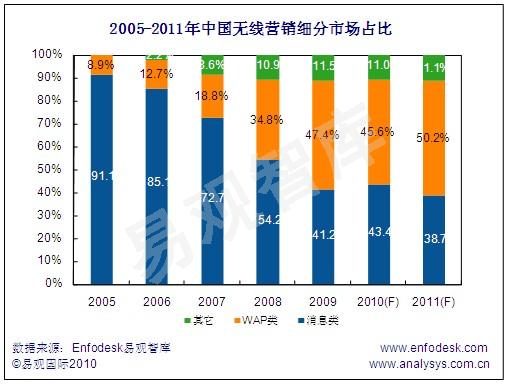 根據(jù)Enfodesk易觀智庫近期發(fā)布《中國無線營銷市場專題報告2010》顯示, 2009年中國無線營銷市場WAP類廣告在無線營銷整體占比達47.4%,其規(guī)模同比增長76.8%,與消息類廣告同比下跌1.3%相比WAP類廣告,已成為無線營銷市場最大推動力量。