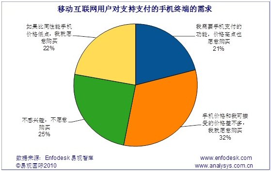 據(jù)Enfodesk易觀智庫最新報告《中國移動互聯(lián)網(wǎng)市場用戶研究報告2010》研究發(fā)現(xiàn),目前在移動互聯(lián)網(wǎng)用戶中,有75%的用戶對具有移動支付功能的手機表現(xiàn)出明顯的興趣,其中影響不大,完全靠性價比決定是否購買的用戶占比最多,約為32%,只有在移動具備支付功能的手機和可接受價格相近時才會購買。另外21%的人由于對移動支付業(yè)務(wù)需求程度較高,愿意為此付出更高價格,其他22%的用戶則在比同性能手機價格低些之后,才會進行消費。除此之外,還有25%的用戶對于具備支付功能的手機沒有絲毫興趣,不愿意購買。