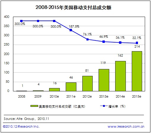 艾瑞咨詢根據(jù)Aite Group發(fā)布的數(shù)據(jù)發(fā)現(xiàn),2010年美國移動支付總成交金額預(yù)估值為16億美元,預(yù)計(jì)2015年這一數(shù)字將攀升至214億美元,將是2010年的13.4倍,復(fù)合年增長率為68%。長期以來,美國移動支付總成交額一直處于被低估的狀態(tài),但它的實(shí)際表現(xiàn)遠(yuǎn)比預(yù)想要好很多。其中,2010年到2011年增長率將高達(dá)187%。