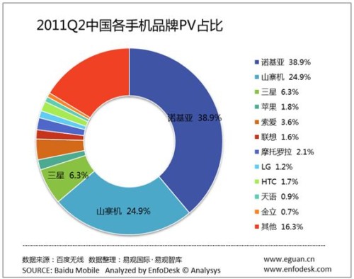 CTI論壇(ctiforum)8月15日消息(記者 潘婷婷): 根據(jù)《移動互聯(lián)網發(fā)展趨勢報告》顯示,在2011年第2季度手機品牌PV占比中,諾基亞市場份額環(huán)比下降3%,跌至39%。其次是山寨機,占據(jù)了25%的市場份額。三星位列第三。