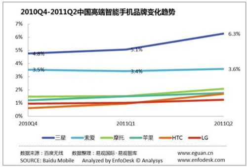 3、HTC、三星、摩托為代表的智能手機收益于Android得到快速發(fā)展。作為最早一批生產Android智能手機的廠商,HTC、三星、摩托羅拉等受益于Android的發(fā)展,PV份額保持增長。另外,第2季度HTC、三星、摩托基于Android的新機型上市也是PV占比增長的原因之一。