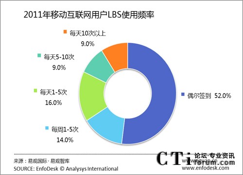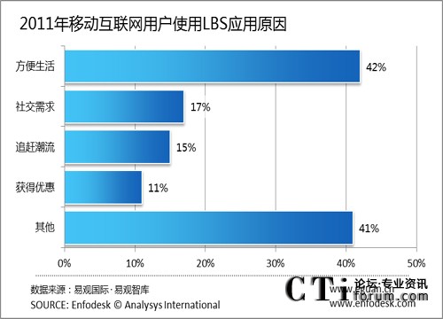 CTI論壇(ctiforum)8月26日消息(記者 張潔):根據易觀國際(Analysys international)最新調研顯示,42%的使用LBS用戶認為使用應用程序可以方便生活,17%的用戶認為是社交需求,15%的用戶只是出于追趕潮流的目的,11%的用戶認為使用LBS應用程序可以獲得一定的優(yōu)惠。