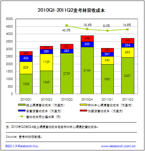 2011Q2凈營(yíng)收為5873萬(wàn)美元,與2010年同期持平,其中線(xiàn)上渠道凈營(yíng)收3271萬(wàn)美元,占凈營(yíng)收的55.7%,同比增長(zhǎng)25.9%,呼叫中心渠道凈營(yíng)收1480萬(wàn)美元,占比25.2%,實(shí)體店渠道凈營(yíng)收1122萬(wàn)美元,占比19.1%;營(yíng)收成本方面,2011Q2為3728萬(wàn)美元,同比上升16.8%,其中線(xiàn)上營(yíng)收成本為2431萬(wàn)美元,占比65.2%,同比增長(zhǎng)55%。