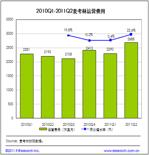 2011Q2麥考林運(yùn)營(yíng)費(fèi)用為2688萬(wàn)美元,同比增加22.6%。據(jù)麥考林CFO披露,2011Q2市場(chǎng)營(yíng)銷(xiāo)費(fèi)用收入的比例為14%,即822萬(wàn)美元(2011Q1市場(chǎng)營(yíng)銷(xiāo)費(fèi)用收入比例為13%,即625萬(wàn)美元,且60%用于線(xiàn)上渠道,40%用于呼叫中心渠道),行政與管理費(fèi)用達(dá)到1774萬(wàn)美元的水平。