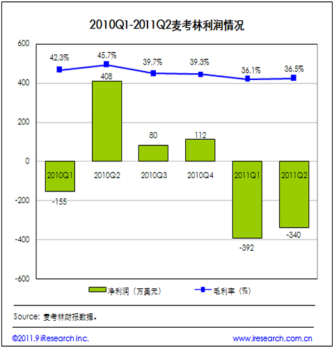 2011Q2麥考林整體毛利率為36.5%,2010年同期為45.7%;2011Q2凈虧損340萬(wàn)美元,2010年同期凈利潤(rùn)為410萬(wàn)美元。