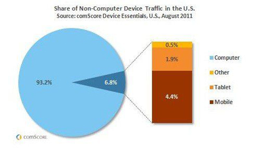 市場研究公司comScore發(fā)表報告稱,8月份,智能手機和平板電腦等“非計算機”設備在美國互聯(lián)網流量中的份額由6月底時的6.2%增長至6.8%。