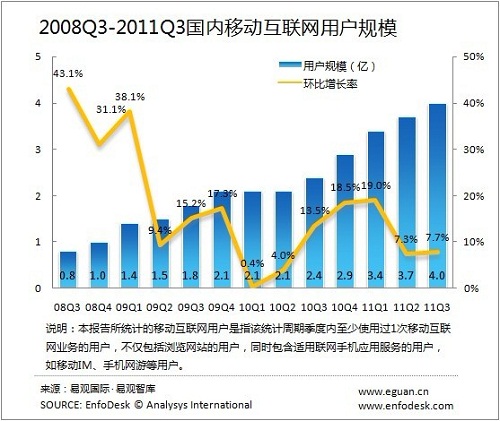 2011第3季度國內(nèi)移動(dòng)互聯(lián)網(wǎng)用戶規(guī)模接近4億
