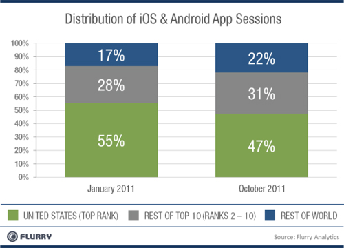 使用iOS和Android設(shè)備和其他新技術(shù)一樣,最早開(kāi)始于可支配收入較高的北美和西歐地區(qū)。然而,隨著型號(hào)較舊的iOS產(chǎn)品價(jià)格下降,以及Android設(shè)備的生產(chǎn)商提供了更多大家買(mǎi)得起的低價(jià)設(shè)備,包括新興市場(chǎng)在內(nèi)的國(guó)際市場(chǎng)的消費(fèi)者越來(lái)越多。下圖顯示了移動(dòng)應(yīng)用下載如何擴(kuò)張到美國(guó)之外。
