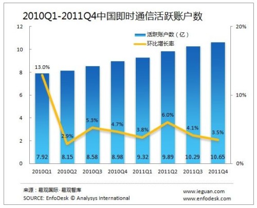 CTI論壇(ctiforum)3月23日消息(記者 潘婷婷): 根據(jù)EnfoDesk易觀智庫(kù)發(fā)布的《2011年第4季度中國(guó)即時(shí)通信市場(chǎng)季度監(jiān)測(cè)》數(shù)據(jù)顯示,截止到2011年底,中國(guó)即時(shí)通信活躍賬戶數(shù)達(dá)到10.65億,環(huán)比增長(zhǎng)3.5%,同比增長(zhǎng)18.62%。