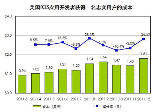 國際著名APP市場營銷組織Fiksu最新的研究數(shù)據(jù)或許能出答案。2011年12月iOS應用開發(fā)者獲得一名忠實用戶的成本達到1.81美元,創(chuàng)下歷史新高。而在2011年第一季度,獲得一名用戶的平均成本為0.94美元,一年間單個用戶成本翻了一倍。當用戶對蘋果商店里花樣繁多的游戲開始麻木,就需要借助有針對性的推廣策略和強大的執(zhí)行,讓產(chǎn)品脫穎而出。如今忠實用戶成本的提高,使得幾乎所有開發(fā)者乃至小團隊都畏懼前期的市場推廣,大中型開發(fā)公司可利用自身的資源循環(huán)造血拉動用戶,越是小的開發(fā)團隊成功的幾率就越渺茫,而被吞并的可能性則大增。