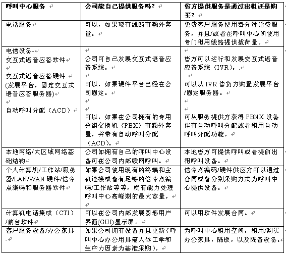。。一旦決定從事呼叫中心業(yè)務,公司必須確定要從外部售貨方購買的服務與設(shè)備的范圍。公司政策和經(jīng)營法則會指示其應遵循什么程序進行這一過程。也可能會是一些合同,它們可以使公司能夠快速地完成這些步驟。