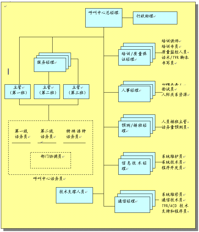 呼叫中心組織結(jié)構(gòu)概述了中心的任務(wù)和職責(zé)。對組織進行了統(tǒng)籌安排以便中心能有效達到工作目標,組織安排主要有: