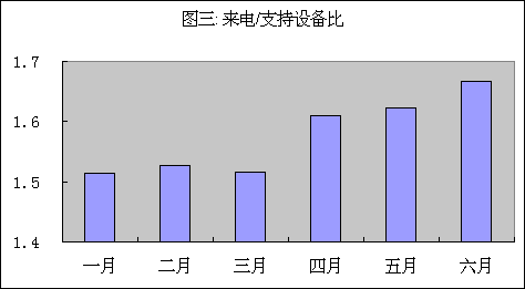 圖一到圖三中我們可以看到來(lái)電總量從一季到下一季度增加了15%。從前一季度開始到后一季度結(jié)束設(shè)備總量增加了8%。每月平均來(lái)話/設(shè)備比在六個(gè)月中從1.5增強(qiáng)到1.7。