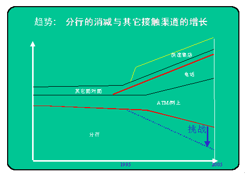 。。下圖為國(guó)外專家對(duì)銀行不同客戶服務(wù)渠道發(fā)展比例的說明?梢钥吹剑瑺I(yíng)業(yè)廳的比例在逐年下降,而國(guó)外不少銀行甚至將進(jìn)一步壓縮營(yíng)業(yè)廳比例作為一項(xiàng)渠道的任務(wù)。電話銀行也就是通過IVR實(shí)現(xiàn)的自助服務(wù),自然是呼叫中心的一部分,但人工服務(wù),包括對(duì)上網(wǎng)及其它互動(dòng)方式的客戶提供的座席代表服務(wù),當(dāng)然更是現(xiàn)代呼叫中心業(yè)務(wù)的一部分,圖上雙紅線內(nèi)所表示的正是不斷發(fā)展的呼叫中心的所占比例。