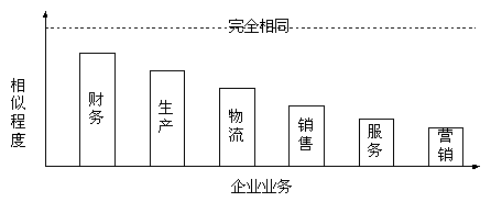 很顯然,企業(yè)間業(yè)務(wù)的相似程度越高,采用商用軟件的有效率越高,企業(yè)在采用商用軟件的時候軟件的客戶化定制就越少,實施的成功率越高。財務(wù)軟件是目前商用軟件通用最有效的企業(yè)管理軟件就是明證。從圖中可以看出前面的幾種業(yè)務(wù),是 傳統(tǒng)ERP軟件支持的功能;而后面的銷售、服務(wù)和市場是目前CRM軟件所要實現(xiàn)的功能。如果說,企業(yè)采用現(xiàn)有的ERP商品套件來滿足企業(yè)運(yùn)營管理的需要還需要30%的客戶化工作,那么如果采用商用的CRM軟件,軟件廠商提供的軟件要應(yīng)用于企業(yè),就需要更多的客戶化工作,這個比例幾乎接近于企業(yè)自己開發(fā)。