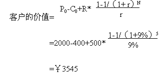 下面舉另一個例子具體說明客戶價值的計算: 假設(shè)客戶與公司保持交易時間:N=5年;公司最初吸引每個客戶的成本(營銷費用): C0=¥400;客戶第一次購買的產(chǎn)品價格:P0=¥2000;公司期望每年從每個客戶處增加的收入:R=¥500;利率(一般指貸款利率): r =9%;那么客戶的價值等于:客戶初次購買產(chǎn)品和以后幾年每年消費價值的折現(xiàn)之和,減營銷成本,即: