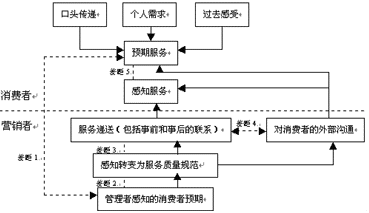柏拉·所羅門、塞登爾和貝利給出了一種服務(wù)質(zhì)量模式,其重要一點(diǎn)是對服務(wù)提供者提供預(yù)期服務(wù)質(zhì)量的主要要求。下圖表明招致服務(wù)失敗的5個(gè)差距: