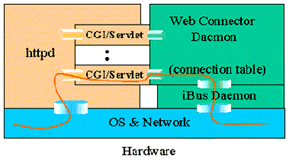 所有來自客戶端的請求(瀏覽器和Applet)都首先發(fā)送給Web Server(HTTP Daemon),然后由httpd啟動(dòng)相應(yīng)的CGI/servlet擴(kuò)展,CGI/servlet模塊僅對上傳的數(shù)據(jù)進(jìn)行簡單的檢查和打包工作然后就傳給Web Connector Daemon,CGI/servlet模塊本身并不處理連接,它是以一種無連接的方式轉(zhuǎn)發(fā)一個(gè)請求再回送應(yīng)答。連接的維持和記錄由Web Connector Daemon建立起連接記錄表來完成。
