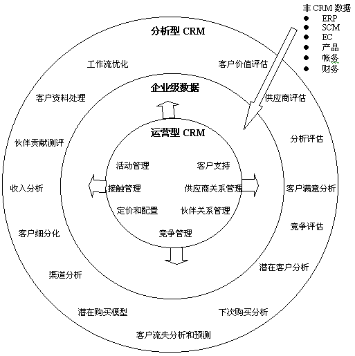 因此,運(yùn)營(yíng)型CRM離不開(kāi)分析型CRM,它們需要一種集成。離開(kāi)分析的CRM就如同沒(méi)有車輪的汽車。如今分析技術(shù)正日趨成熟,如聯(lián)機(jī)分析處理(OLAP)、理論與實(shí)際結(jié)合的數(shù)據(jù)挖掘、點(diǎn)擊流分析、個(gè)性化和協(xié)作過(guò)濾等。