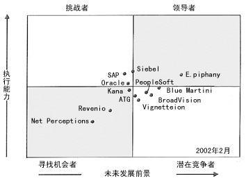 Siebel 和Oracle因?yàn)樵谄銫RM中整合了E-Marketing以及公司強(qiáng)大的資金實(shí)力,因此在挑戰(zhàn)者中最為引人注目。預(yù)計(jì)Siebel 將在6到12個(gè)月內(nèi)進(jìn)入E-Marketing市場(chǎng)的領(lǐng)導(dǎo)者行列。SAP首次出現(xiàn)在這一群體之中,但是它的強(qiáng)項(xiàng)在于其產(chǎn)品易于與已安裝的其它軟件相集成,而不是其E-Marketing的功能,這一點(diǎn)限制了那些沒(méi)有購(gòu)買過(guò)SAP產(chǎn)品的企業(yè)接受其產(chǎn)品。